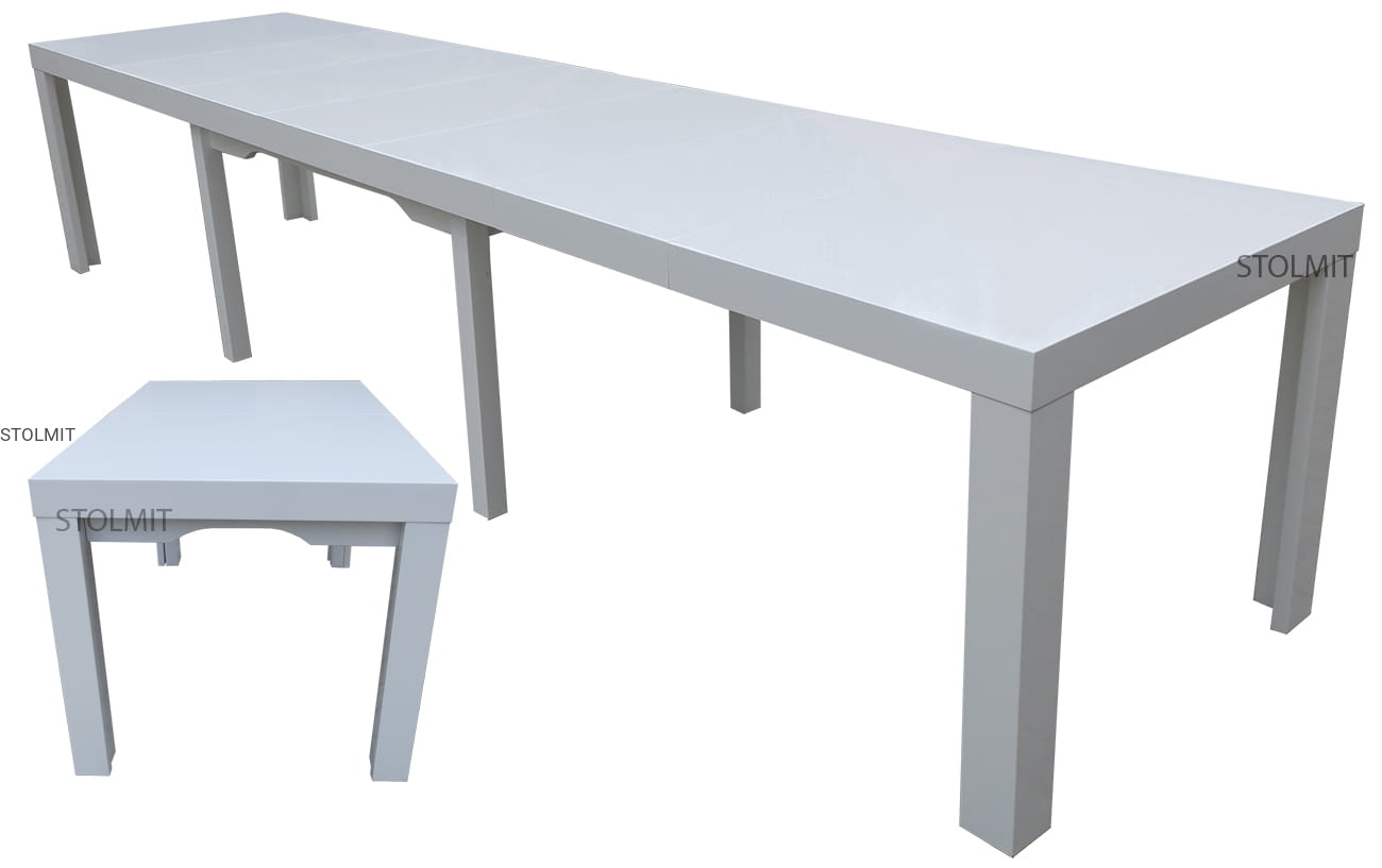 Stół kwadratowy może rozsuwać się o trzy, cztery lub pięć wkładów powiększających. Stół ma wymiary do wyboru z listy po prawej stronie oferty lub inne do indywidualnej wyceny. Jako producent stołów oferujemy wykonanie stołu białego na każdy wymiar kwadratowego lub prostokątnego.