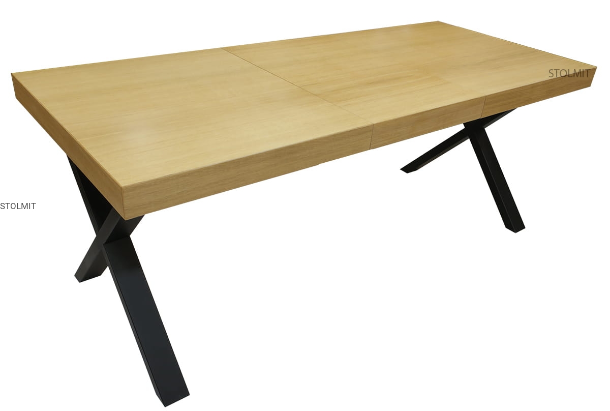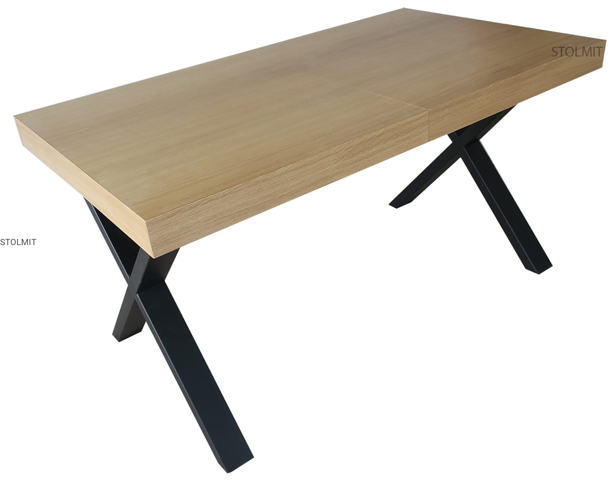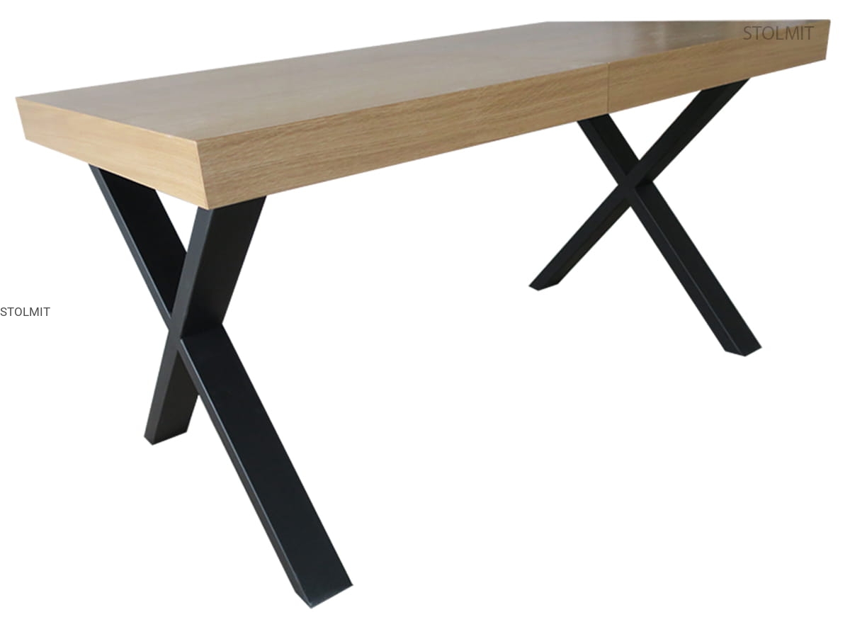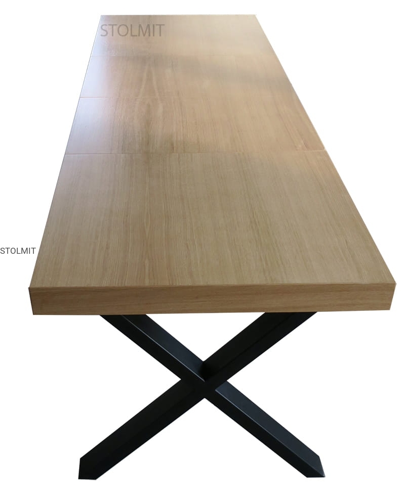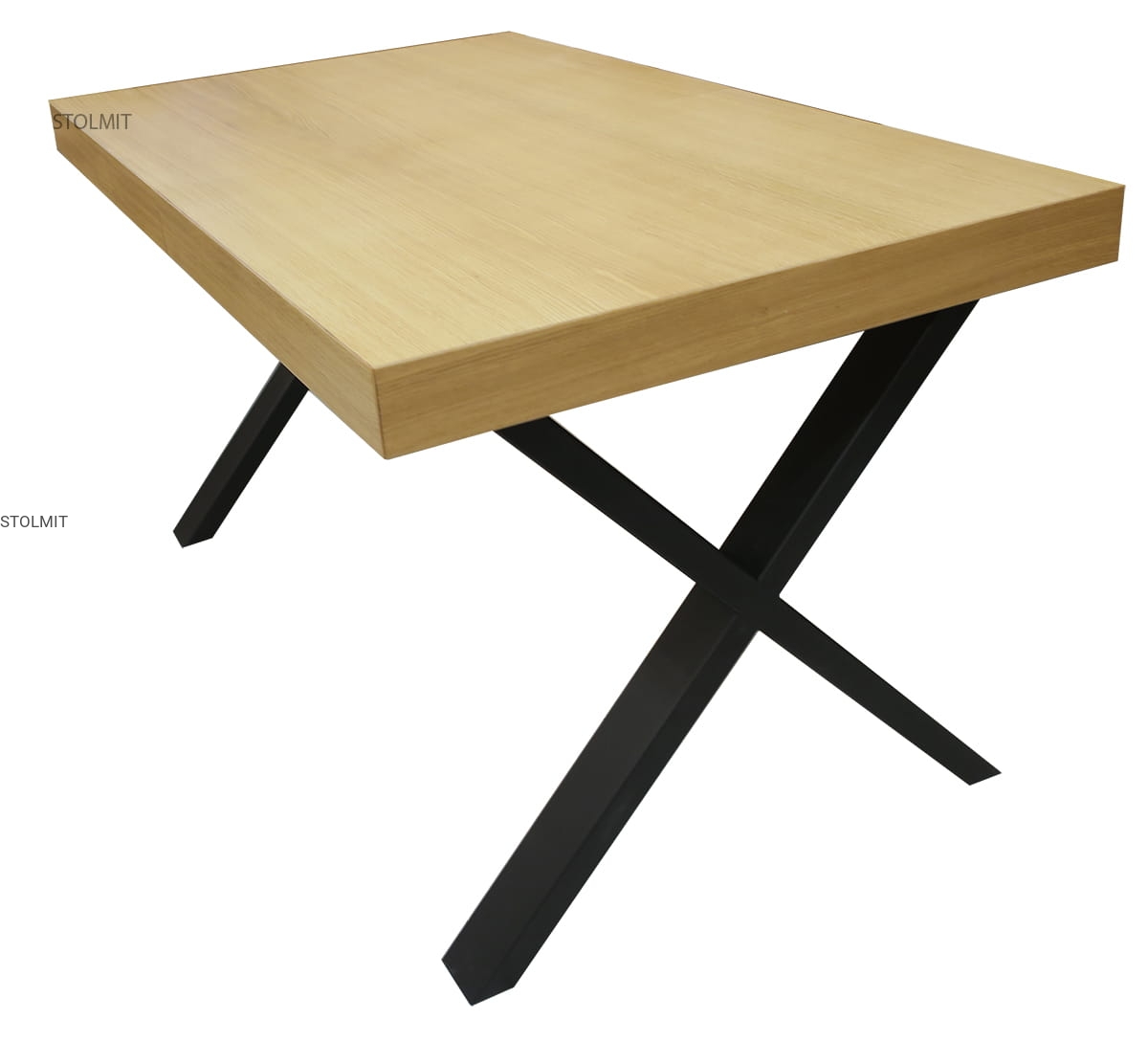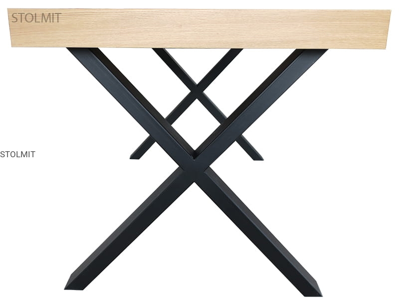 Industrialny stół w stylu loft: nogi stalowe czarne lakierowane proszkowo w tej ofercie są w kształcie litery X lub U do wyboru. Blat wykonany z okleiny naturalnej dębowej odcień może być jak na zdjęciu naturalny dąb lub każdy inny z karty kolorów bejc "karta kolorów".