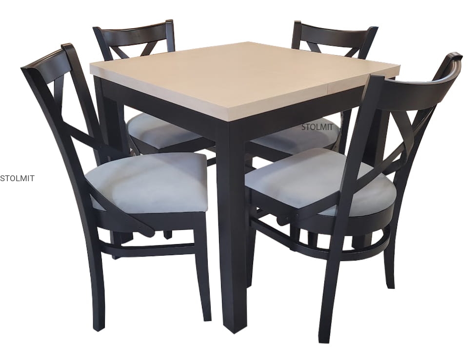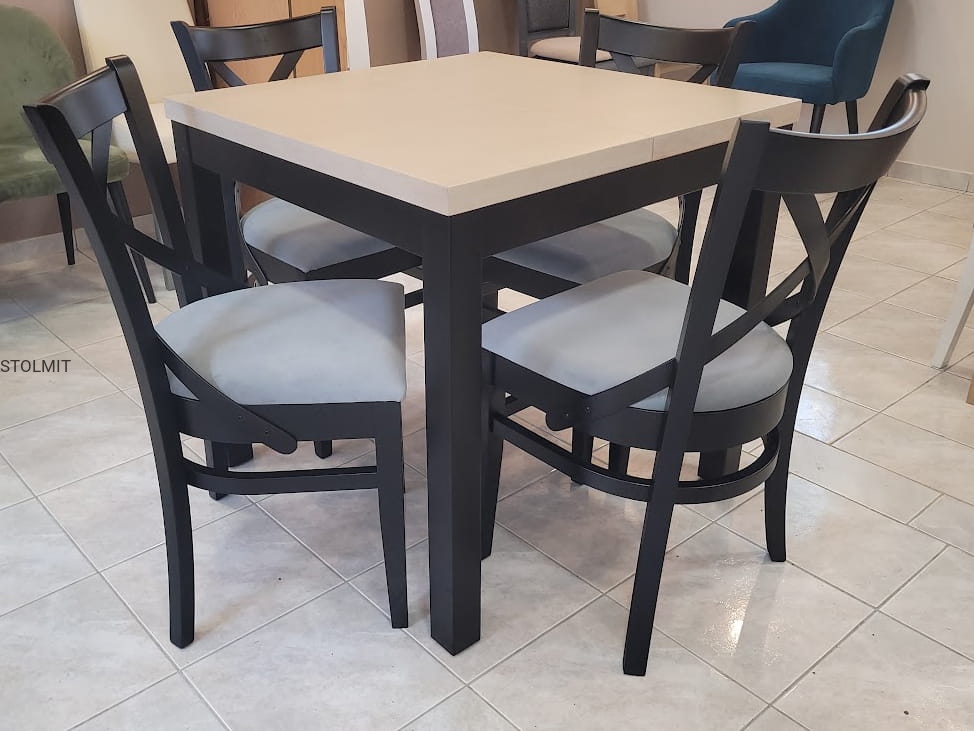 Ilość krzeseł w zestawie ze stołem to 4 sztuki. Krzesła są eleganckie i wygodne, wykonane z drewna bukowego lakierowanego w tym samym odcieniu co stół lakierem matowym. Siedzenie i oparcie wykonane jest z pianki tapicerskiej które obite jest dowolną tkaniną dostępną w naszych wzornikach (inne na zamówienie). Wykonujemy krzesła obite skórą naturalną oraz z materiałów wysokiej jakości z włóknami hydrofobowymi odpornymi na plamy - łatwo czyszczącym np. top textil, magic home, clenaboo itp.