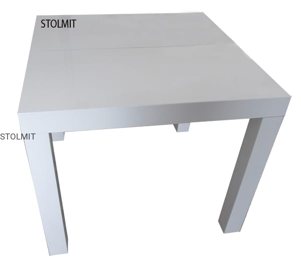 Stół kwadratowy wykonany jest z płyty meblowej gładkiej matowej białej lakierowanej wysokiej jakości włoskim lakierem kryjącym dwuskładnikowym chemoutwardzalnym. Nogi stołu wraz z kantem i skrzynią wykonane są z drewna bukowego i lakierowane tym samym lakierem co blat stołu. Blat stołu jest rozkładany wraz z nogami, wkłady nie mieszczą się pod blatem należy przechowywać je poza stołem.