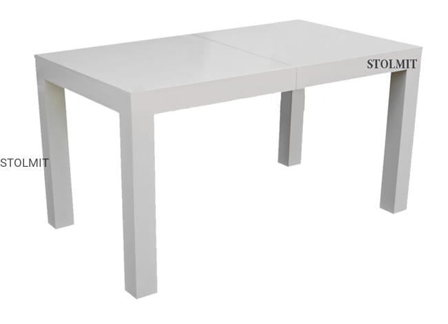 Stół prostokątny wykonany z płyty meblowej matowej gładkiej lakierowanej wysokiej jakości lakierami z filtrami UV w odcieniu bieli. Nogi stołu wraz z kantem i skrzynią wykonane są z drewna i lakierowane podkładem białym kryjącym bez prześwitów w drewnie.