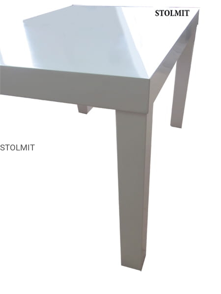 STÓŁ wykonany jest z drewna, lakierowany i polerowany w wysokim połysku. Na blacie nie powstają odbarwienia np po ciepłych przedmiotach tj. talerze/ kubki czy wylany na blat alkohol czy sok (oczywiście każdy płyn/zabrudzenie po wylaniu należy usunąć od razu). Lakier jest wysokiej jakości z filtrami UV.