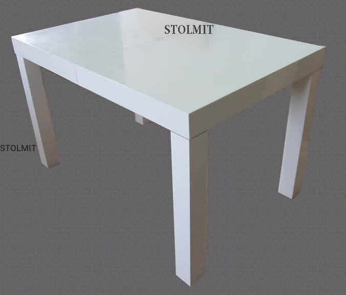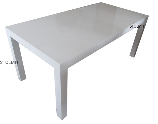 Masywny stół wykonany z drewna i płyty meblowej lakierowany i polerowany na wysoki połysk - high gloss. Blat jest w całości lub rozsuwa się na solidnych prowadnicach stopniowo o jeden lub dwa wkłady powiększające. Stół lakierowany jest w połysku lakierem z filtrami UV odcień zimnej bieli.