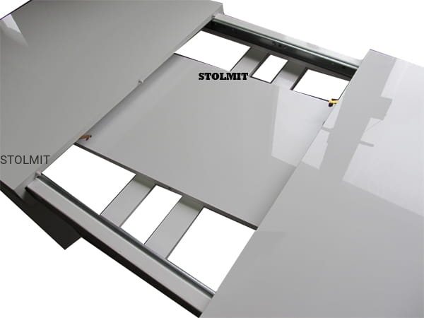 Masywny stół wykonany z płyty meblowej i drewna w całości lakierowany i polerowany na wysoki połysk - high gloss. Blat rozsuwa się wraz z solidnymi aluminiowymi prowadnicami o jeden wkład powiększający. Wykonujemy stoły z dwoma, trzema i czterema wkładami na zamówienie.