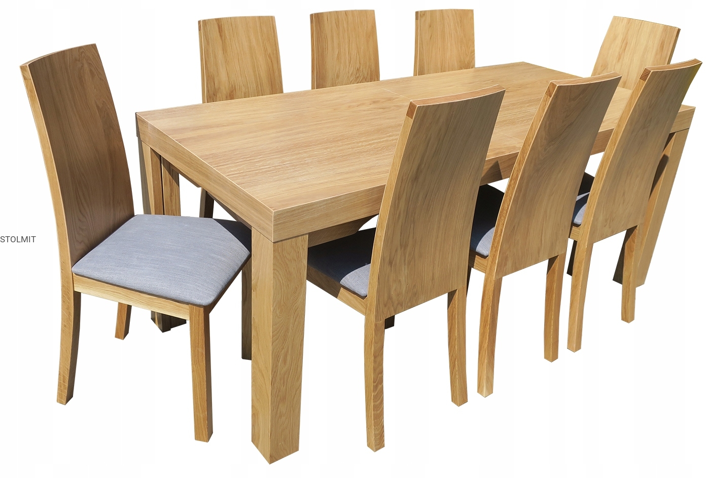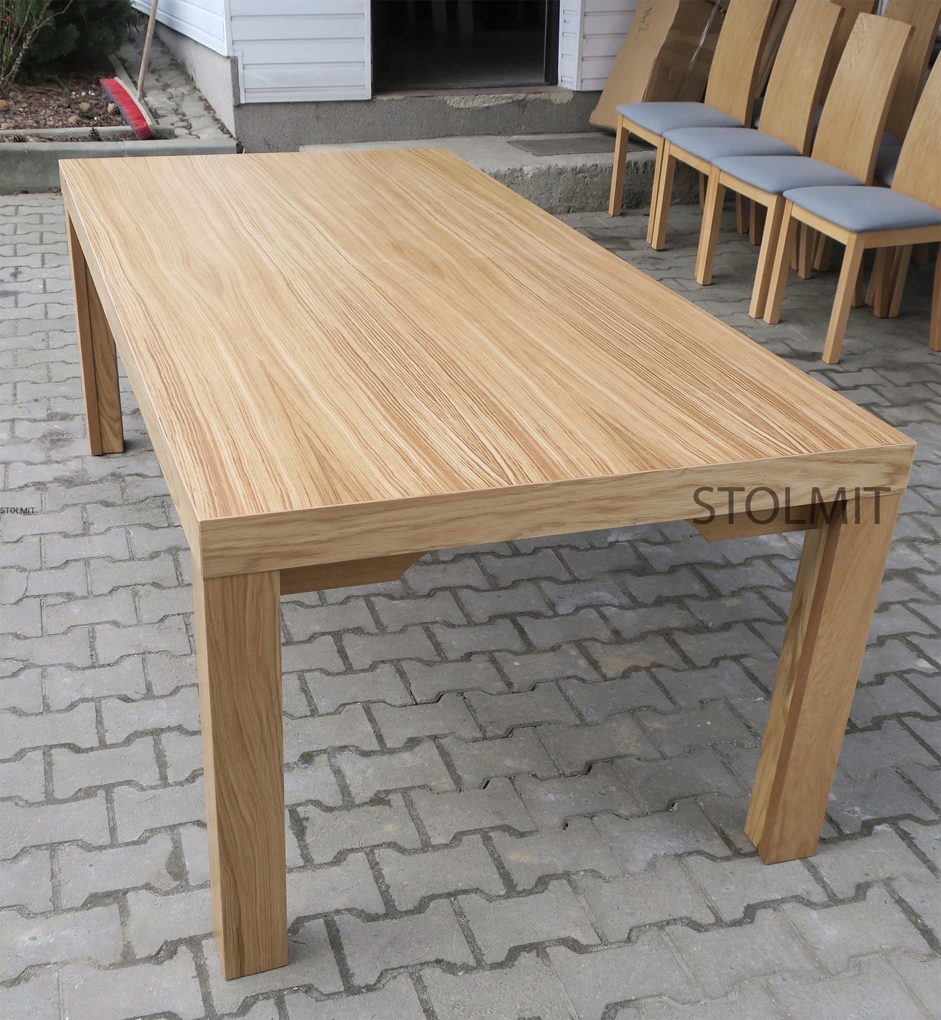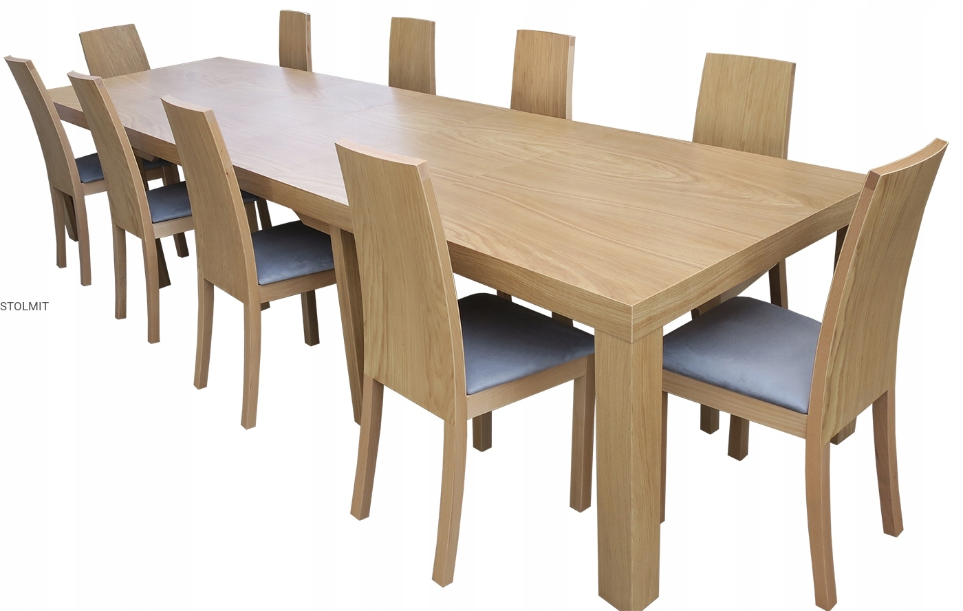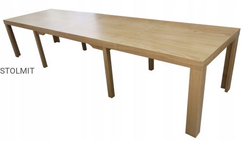 Masywny stół typu 8 nóg rozkładany do dużych wymiarów, dzięki zastosowaniu nowoczesnej prowadnicy i konstrukcji ośmiu nóg stół jest stabilny. Blat rozsuwany za pomocą solidnych nowoczesnych aluminiowych prowadnic i pięć wkładów powiększających 5x50 cm. Wkłady używamy stopniowo w zależności od potrzeb. Jeden wkład znajduje się pod blatem, pozostałe należy przechowywać poza stołem. Stół w tej ofercie ma wycinaną w łuk wewnętrzną ramę - calgę jak na zdjęciach stołu poniżej czy zestawu z krzesłami, jest to wygodne rozwiązanie które nie przeszkadza w użytkowaniu stołu - nogi swobodnie mieszczą się pod stołem.