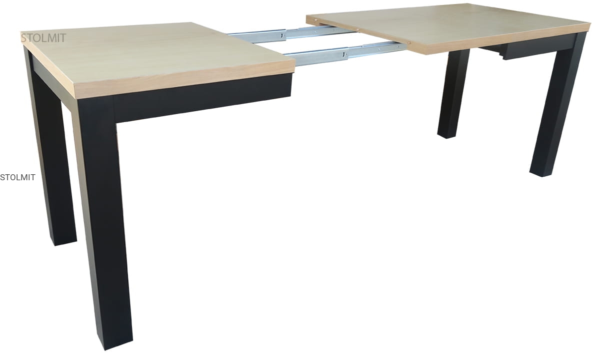 - z jednym wkładem rozsuwa się tylko blat, nogi zostają w miejscu, wkład mieści się pod blat do wymiaru od 120x80 +40. Na zamówienie można dokupić prowadnice synchroniczną linkową lub stół może rozsuwać się z nogami