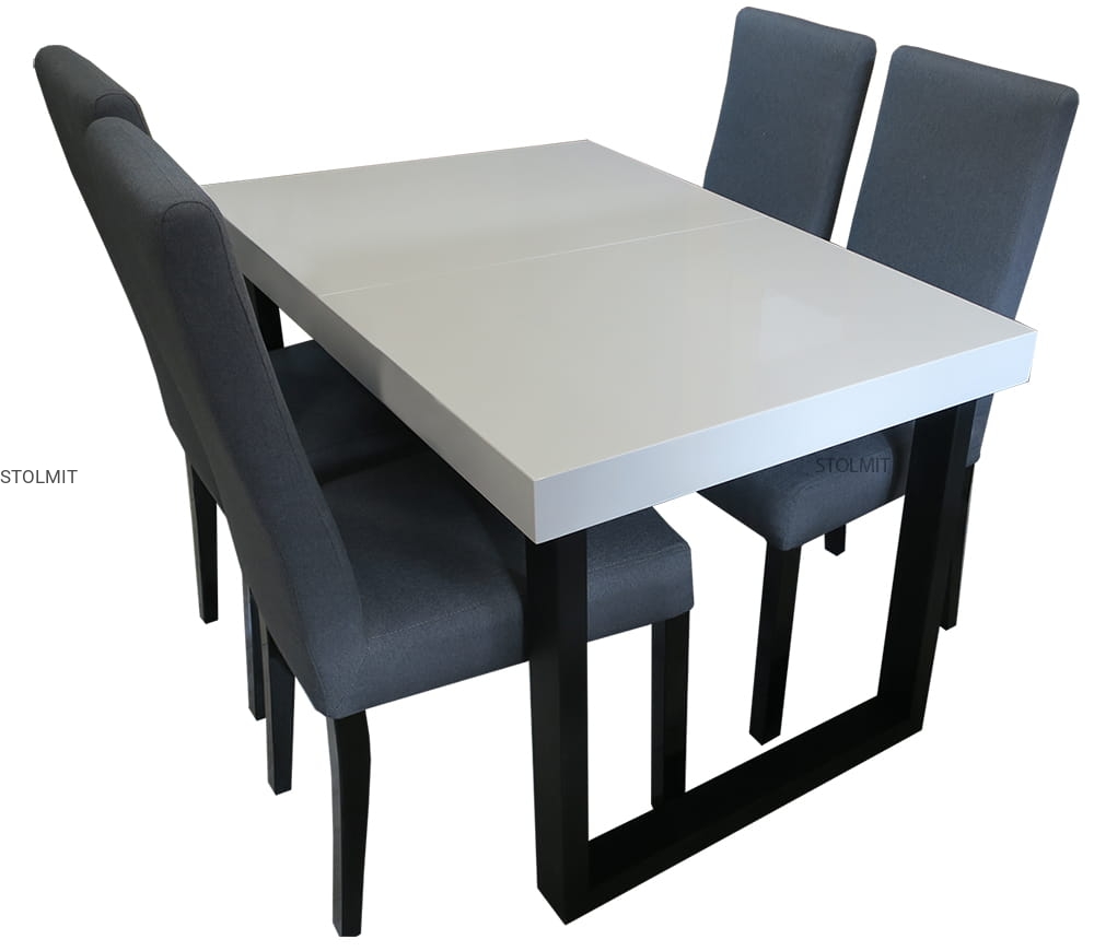 W zestawie ze stołem oferuje 4 krzesła "komin", jest to wygodne klasyczne krzesło pasujące do każdych wnętrz. Nogi krzeseł są czarne matowe lub białe matowe. W naszej ofercie jest bogata kolorystyka tkanin standardowych lub tych nowoczesnych impregnowanych z włóknem hydrofobowym łatwo czyszczącym w cenie lub za dopłatą do indywidualnej wycen w zależności od tkaniny.