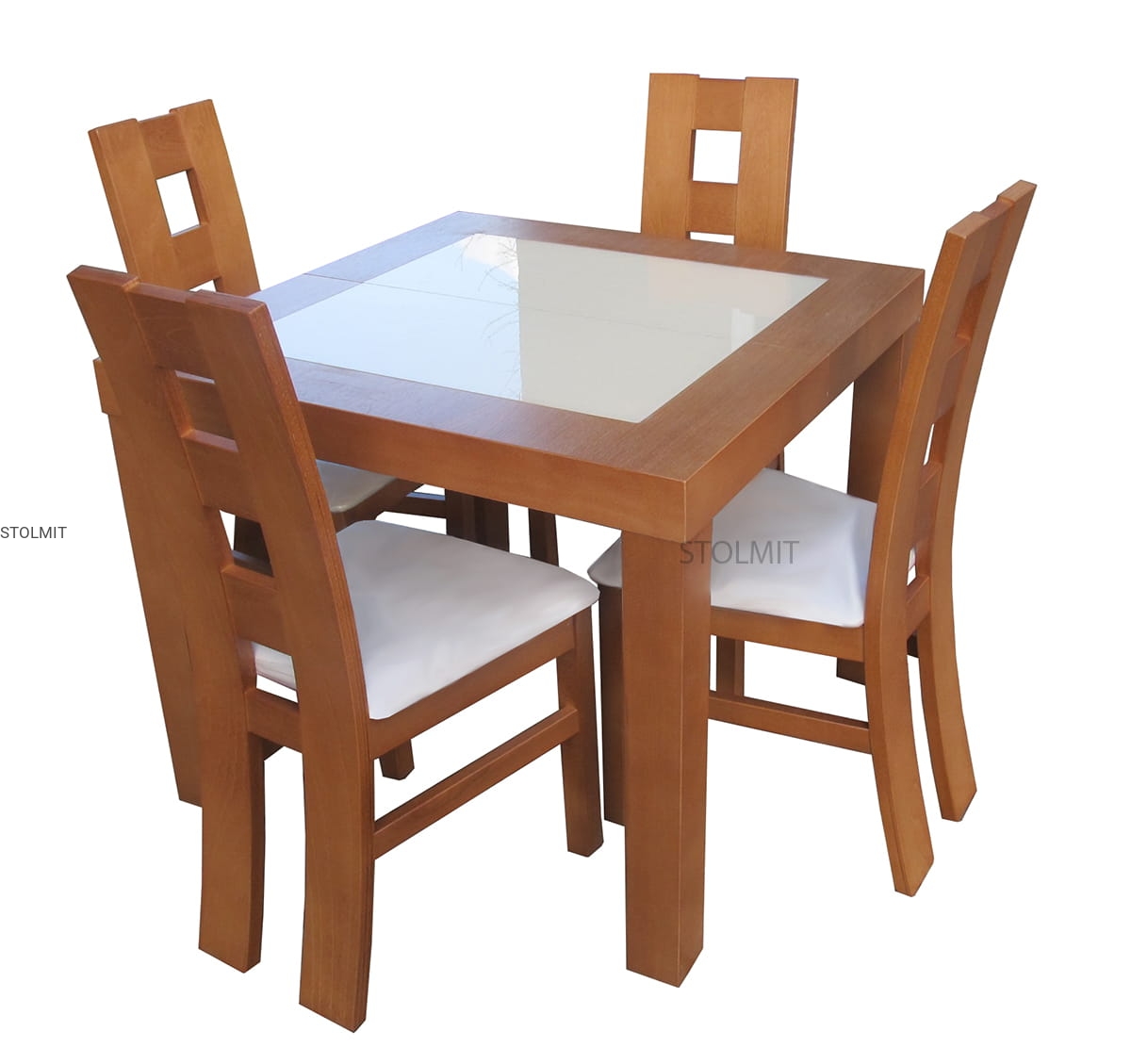 Stół kwadratowy wykonany jest na blacie z okleiny naturalnej dębowej lub bukowej oraz na zamówienie z płyty meblowej laminowanej -> patrz zakładka "karta kolorów". Nogi, rama stołu i kanty wykonane są z drewna bukowego i lakierowane w tym samym odcieniu co blat stołu, na zamówienie możemy wykonać stół cały dębowy na blacie kantach i nogach.
