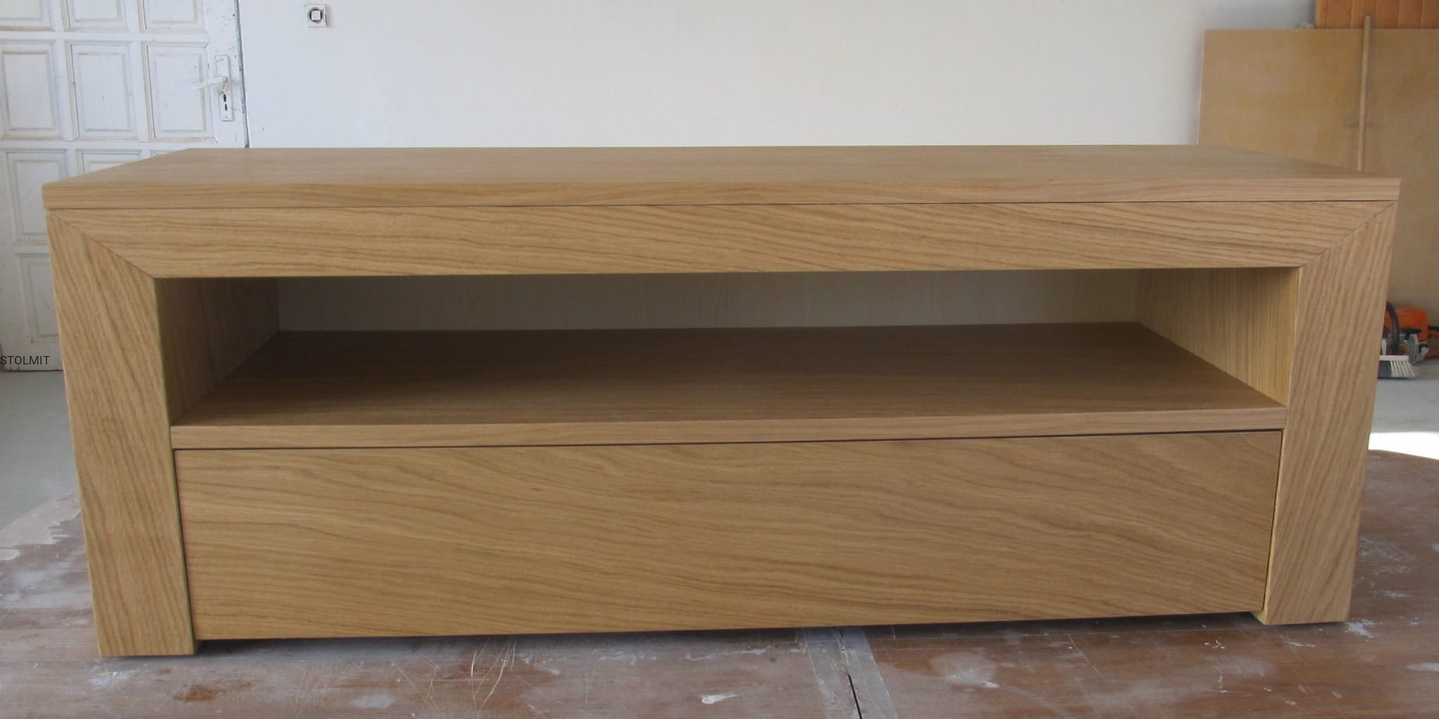 Oferuje wykonanie stolika rtv wykonanego z okleiny naturalnej dębowej wybarwionej dowolnym odcieniem z palety bejc. Stolik na zdjęciu posiada 1 szufladą typu tip-on oraz półkę.